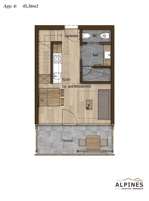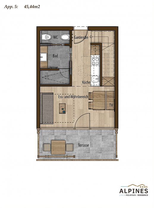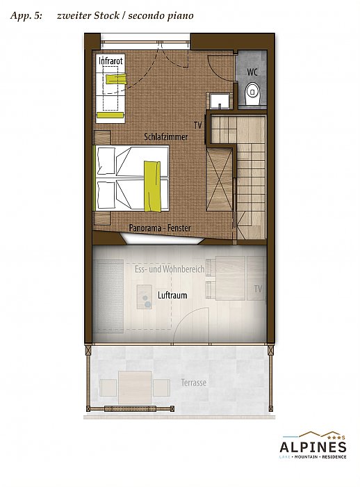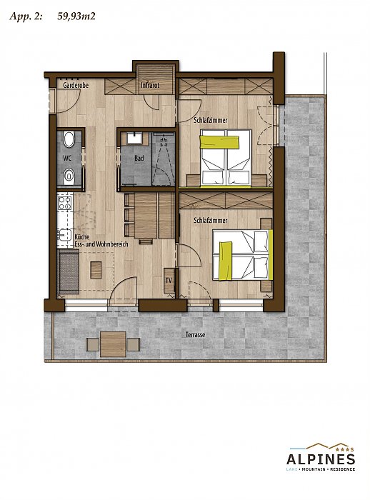 The apartment has an area of 38 m². The apartment has a modern kitchen/living room, bathroom with toilet, a separate bedroom with INFRARED bed and flatscreen TV and a living area with a comfortable double sofa bed. In the living area, there is a flatscreen TV and a seating area. The apartment is completely free of architectural barriers. From the apartment, you can exit directly onto the panoramic garden terrace.