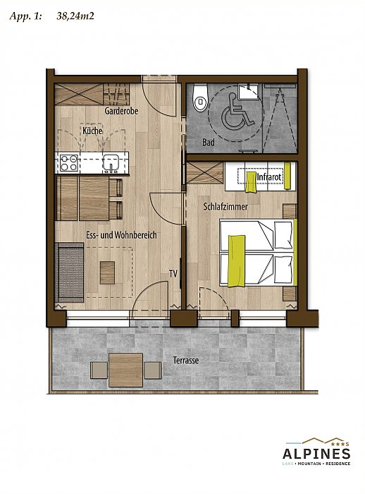 L’ appartamento ha una superficie di 38 m². L’ appartamento è dotato di una moderna cucina/soggiorno, bagno con wc, una camera da letto separata con lettino INFRAROSSI, TV flatscreen e una zona giorno con un comodo divano letto matrimoniale. Nella zona giorno c’ è una TV flatscreen e una zona salotto. L’ appartamento vacanza è completamente privo di barriere architettoniche. Dall’ appartamento si può uscire direttamente sul terrazzo giardino panoramico.